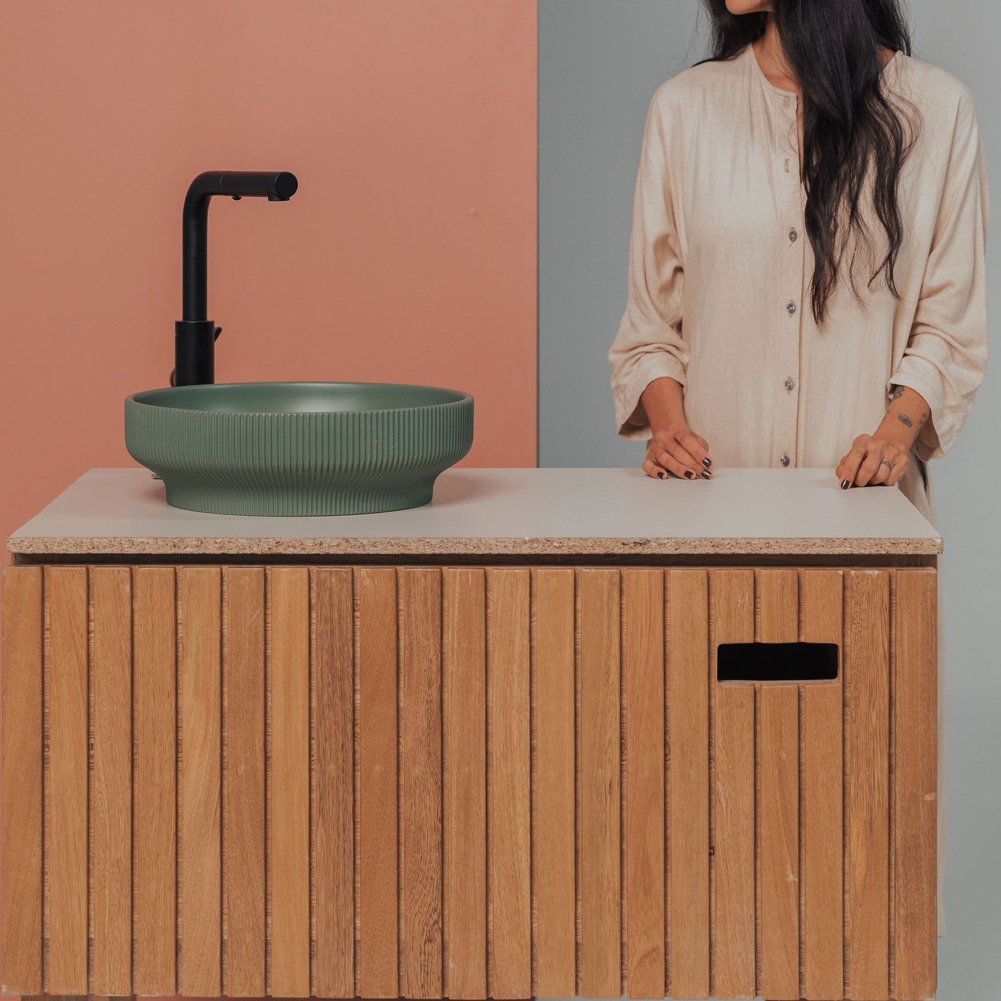 Handcrafted in Colombia, each piece carries the individuality of the casting and finishing process, with natural variation in tone, pores, and texture that make every basin one of a kind. The smooth interior contrasts beautifully with the outer form, creating a composition that feels both functional and elevated. Whether paired with stone, wood, or matte metal fixtures, Lotus 01 brings a refined sense of luxury to contemporary bathroom spaces.