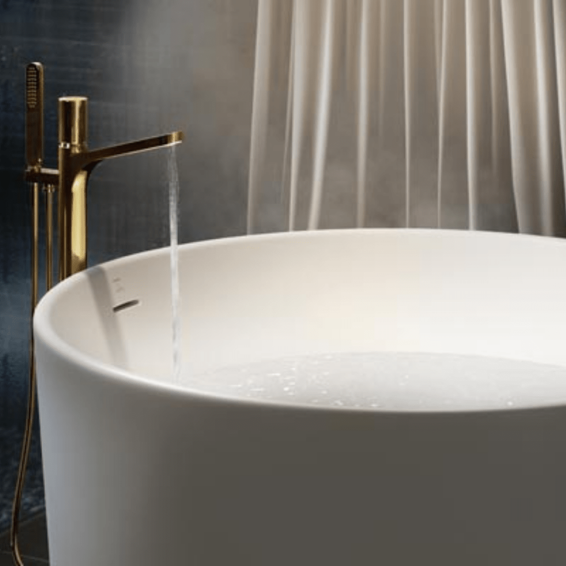 Presenting the Equilibrium bathtub from the house of Pomd'or. The creativity of Edward van Vliet,the mastery of the porcelain work of Rosenthal and the seductive language of the designs of Pomd’or have all joined forces to create Equilibrium. The tub is comprised of 75% natural minerals mixed with 25% polyester resin. The gel coating provides a surface that is highly durable, elegant to the touch and extremely hygienic. The make up and size of this tub makes it extremely versatile and an easy centerpiece even if space is at premium. Take a hot bath with precious essences and oils and let the Equilibrium tub transport you to a wellness oasis.