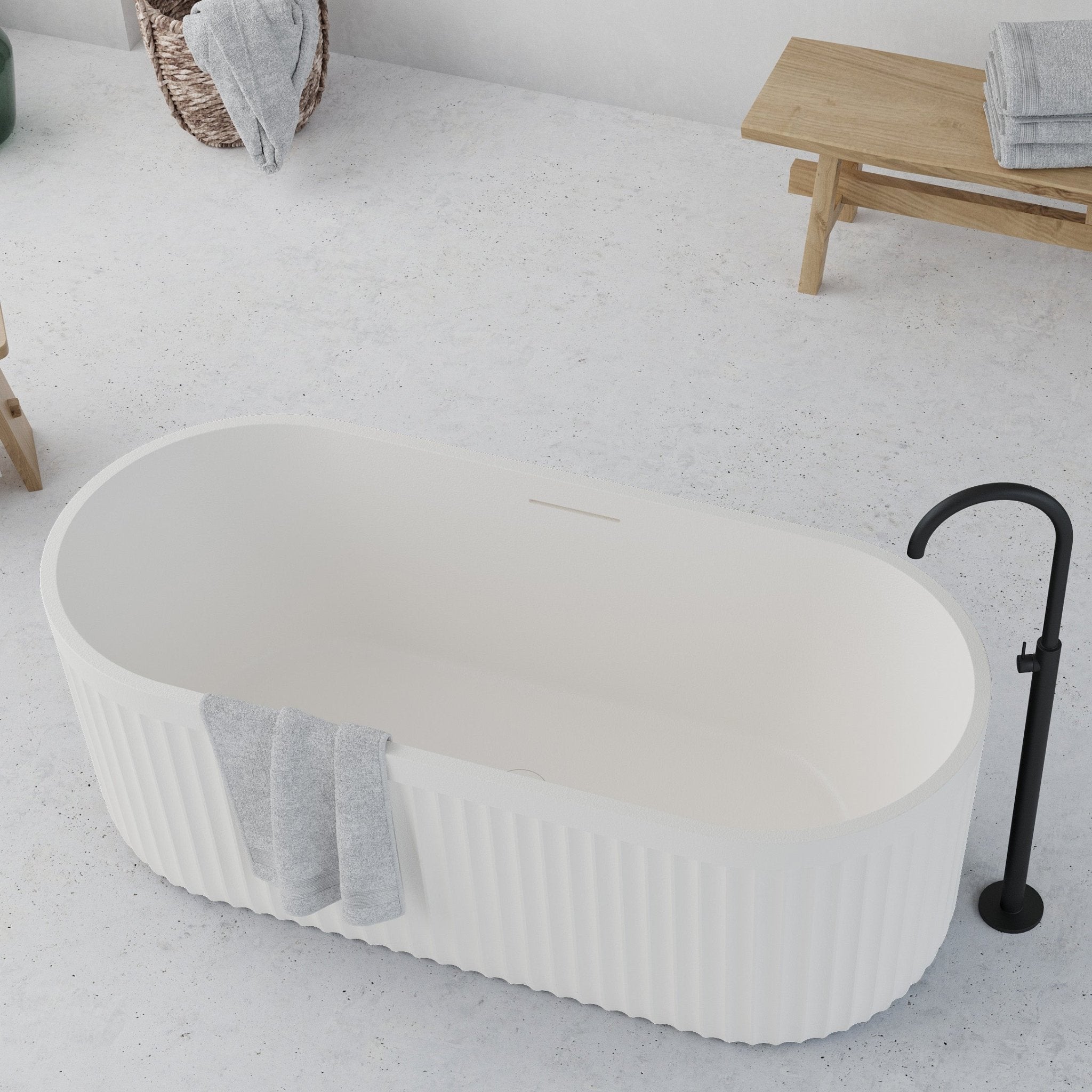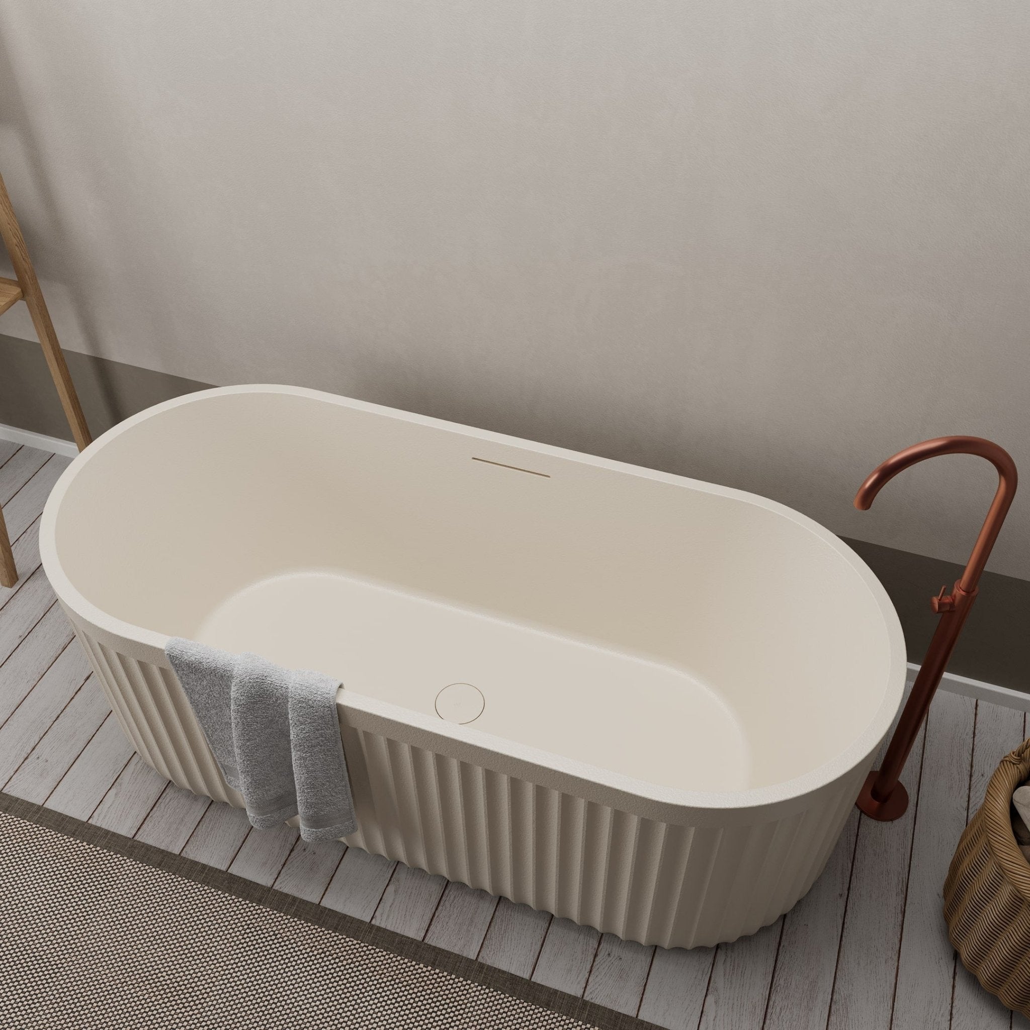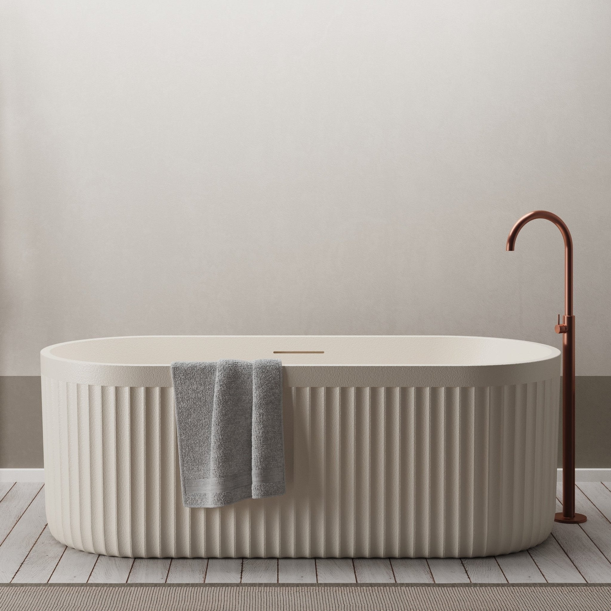 The rock texture material is a premium composite of gel coat, vinyl resin, calcium carbonate powder, fiberglass, and a high-quality anti-fouling coating. This innovative blend replicates the natural look and feel of rock, delivering exceptional durability, comfort, and timeless visual appeal. The bathtub’s exterior boasts a distinctive fluted relief surface, offering a tactile experience that harmonizes rugged charm with modern refinement.